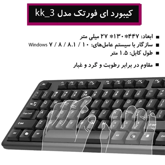 کیبورد ای فورتک مدل KK 3 با طراحی ارگونومیک و کلیدهای نرم، تجربه تایپ راحت و سریع را برای شما به ارمغان میآورد. این کیبورد با مقاومت بالا در برابر ضربه و عمر طولانی، گزینهای ایدهآل برای کارهای روزمره و حرفهای است.